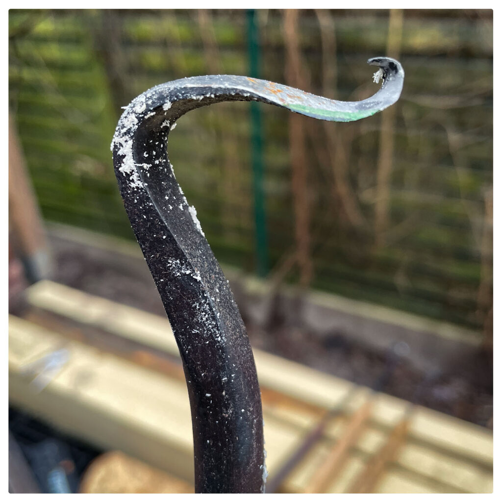 Om de bolle vorm te kunnen draaien, heb je andere draaihaken nodig, dan de standaard, rechte haken die we meestal gebruiken. Om goed onder de rand te kunnen komen, zou je bijvoorbeeld een haak kunnen gebruiken zoals hierboven is afgebeeld en/of deze die Martijn op de foto hieronder vast heeft. Vandaag diende ook als test voor de draaihaken die we ter beschikking hadden. In hoeverre deden ze wat we wilden dat ze deden, en in hoe moeten ze eventueel nog aangepast worden?